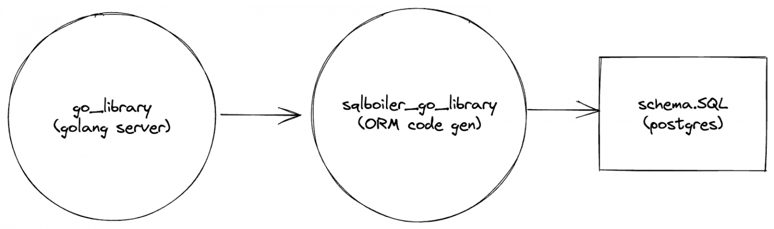 The code above is how Bazel represents its build graph. We have schema.sql be an input to sqlboiler_go_library and have sqlboiler_go_library be an input to our server. Thus, we have created the dependency graph outlined in the beginning of this article.
