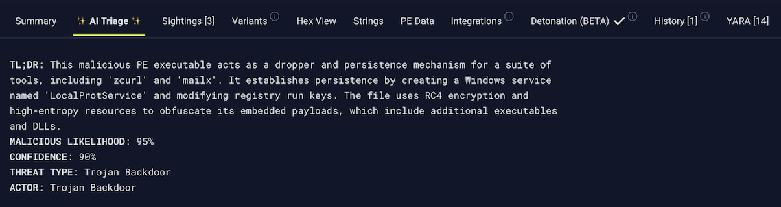 Hash lookup in VirusTotal returns nothing. Or it returns 2 of 70 detections, which tells you very little. AI Triage gives you a full breakdown of what the file does, why it is suspicious, and what to do next. In seconds.