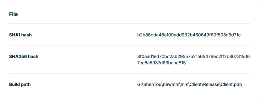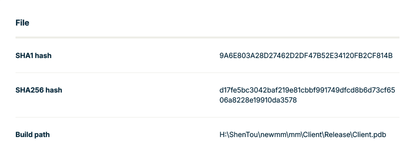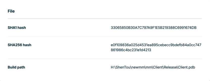 From the samples uncovered with Variant Discovery so far, there are some common elements. The most notable are the build paths that are worth exploring. While the drive letter changes, the build path starting with ShenTou remains consistent, potentially indicating the developer is working off a shared network resource. When crafting a few searches using some unique directory names like newmm, calldll, and shentou from the PDB paths, we can surface additional samples to examine further.